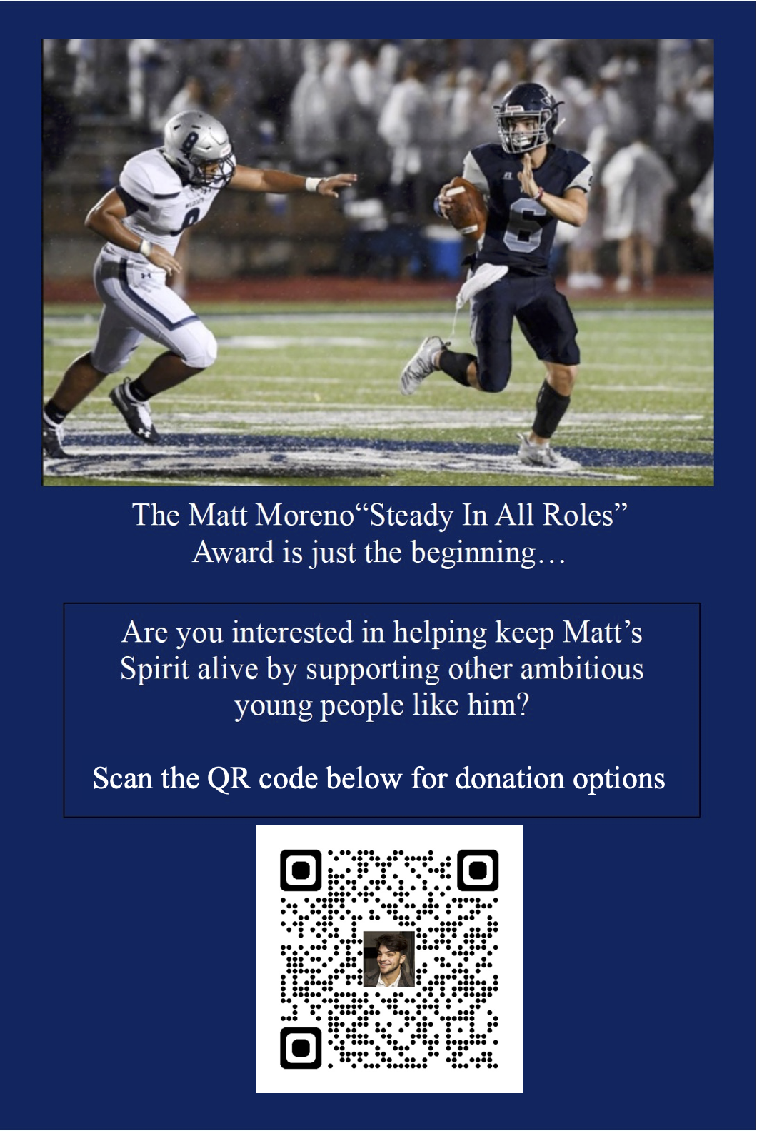 The Matt Moreno “Steady In All Roles” Award is exclusively awarded to a football player on the Bryan High School football team. Matt played for the Bryan Vikings and was awarded Offensive Player of the Year during his senior season. A newspaper article titled “Steady in all roles” was published by the Bryan-College Station Eagle. Matt was recognized as a strong team player that represented the team very well both on and off the field. The interesting part of Matt’s story that is not told, is how he became the starting quarterback which actually led to him receiving the Offensive Player of the Year Award. Matt never sought to be the quarterback for this team; he was enjoying playing in other positions. What he did do, was volunteer to be the quarterback for the practice squad that the starting defense trained against. In observing how well he was playing in that capacity, Coach Rogers decided that Matt should actually be his back-up quarterback. While attending a practice session, Coach Rogers actually told me that was his plan. I told Matt that evening and he was surprised. Coach Rogers had not yet told him, so he wasn’t certain if I was joking or if it was going to happen. In the end it did. In addition, just a couple of games into the season, the starting quarterback, one of Matt’s great friends, Kerry Brooks, experienced a season ending injury. The rest is history. The point is that every team has someone that is “Steady in all roles”. Some will coincidentally get an opportunity like Matt, do well on the field, and receive a traditional award. This award was conceived to acknowledge those that have that potential, whether they receive the opportunity to display on the field or not. Lastly, the other characteristic that Matt brought to the table that influenced many of his teammates, was his ambition. This award seeks to acknowledge that as well. Candidates will have a definitive vision for their future and demonstrated genuine potential to bring that vision to reality. Our hope is that the award helps them launch on that trajectory.